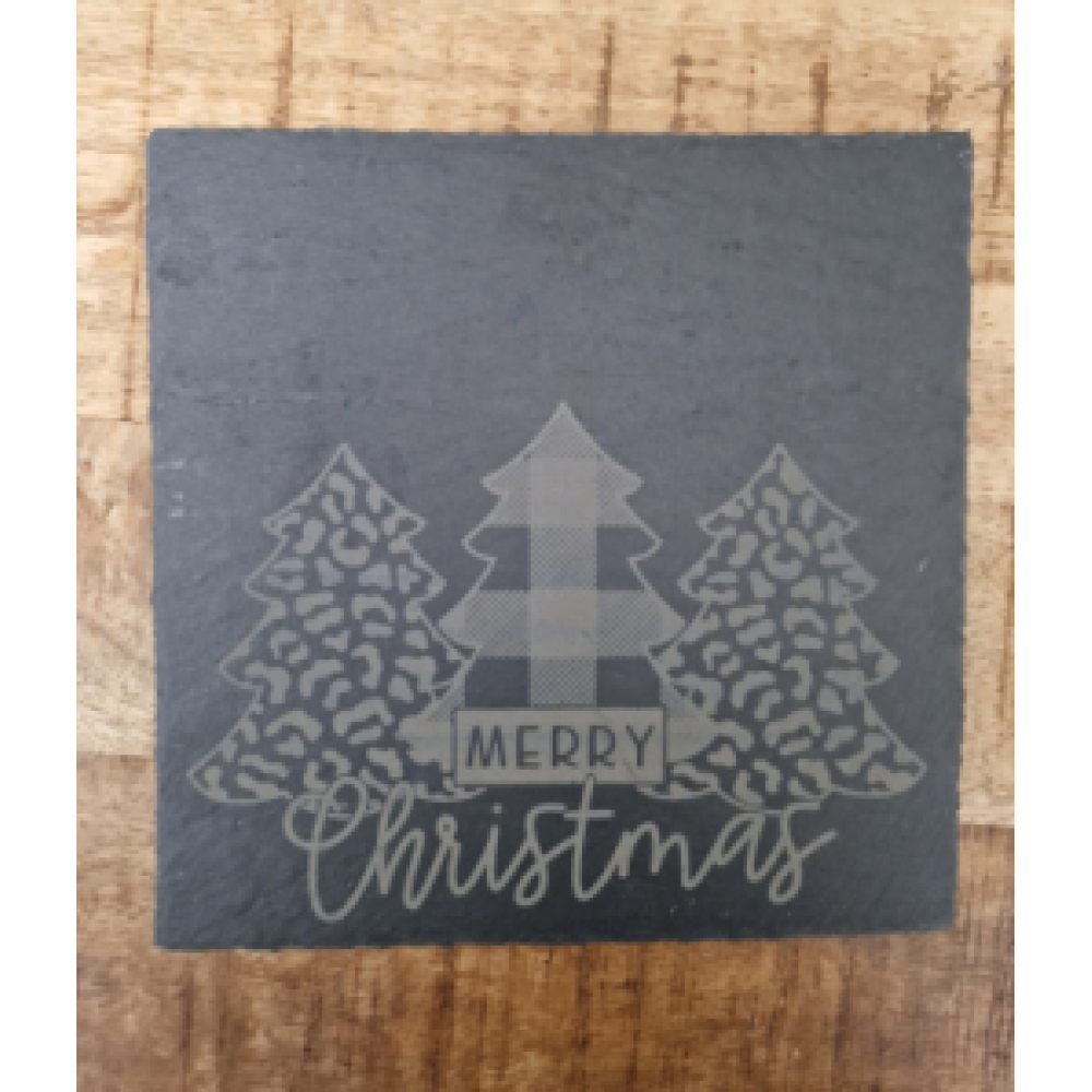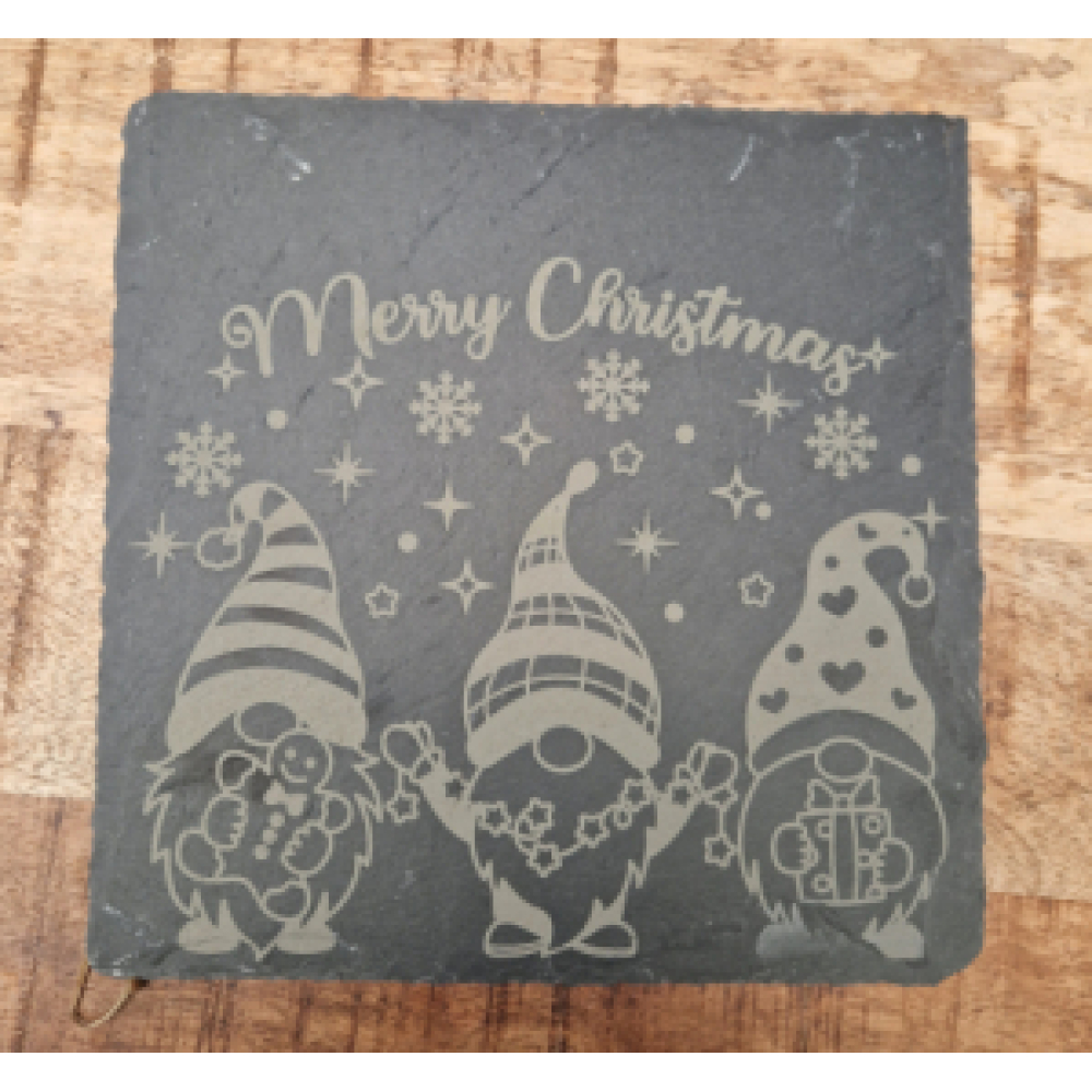 Vierkante serveerplank of kaarsenbord van leisteen met leuke gelaserde kerstafbeelding.