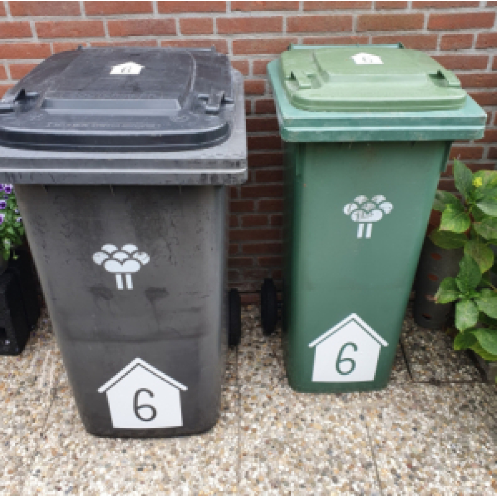 Je ontvangt een set van 4 stickers met huisnummer. 2 grote stickers voor op de bak van ca 25cm en 2 kleine stickers voor op het deksel van ca 10 cm.