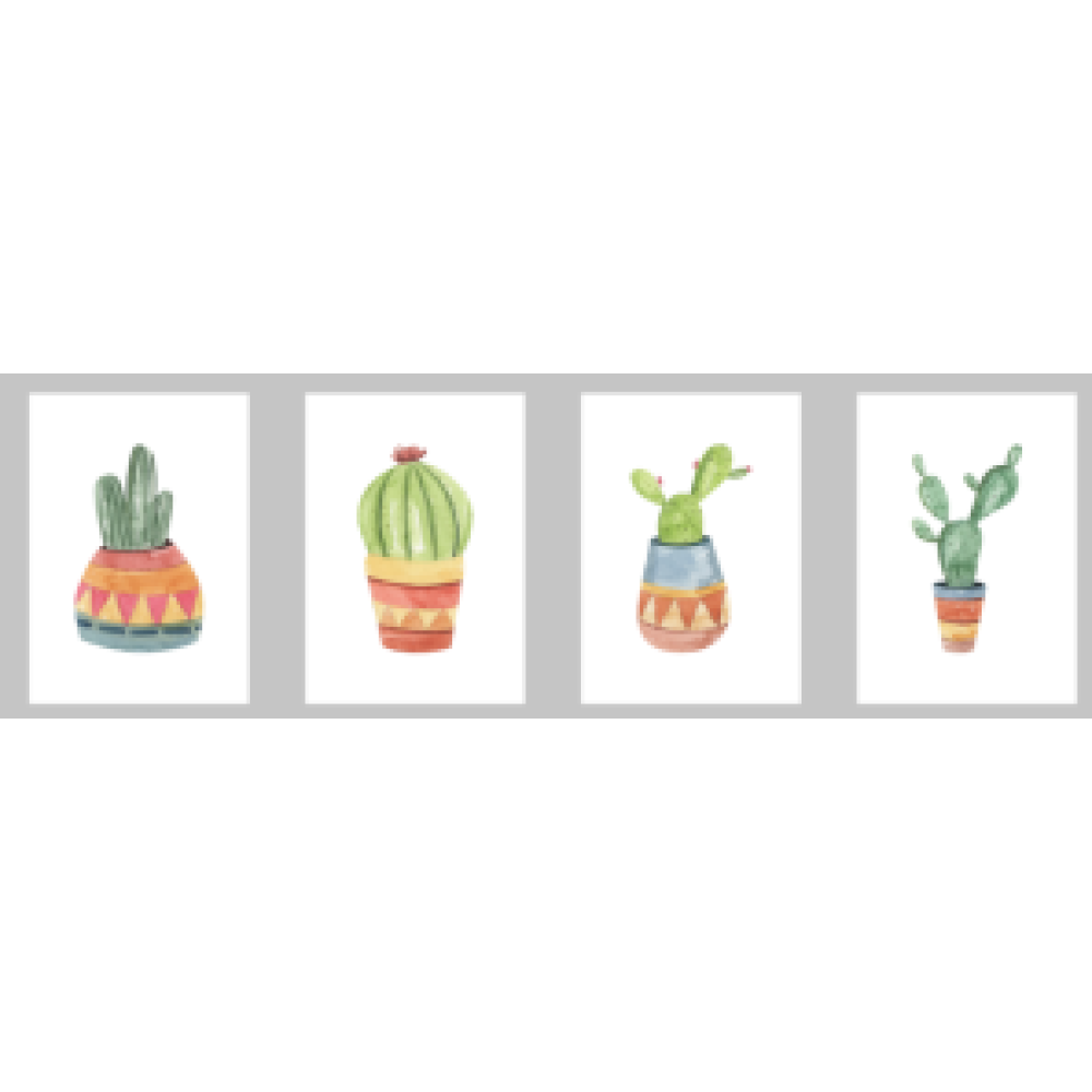 Set van 4 posters met verschillende cactussen in pot, uitgevoerd in watercolor print