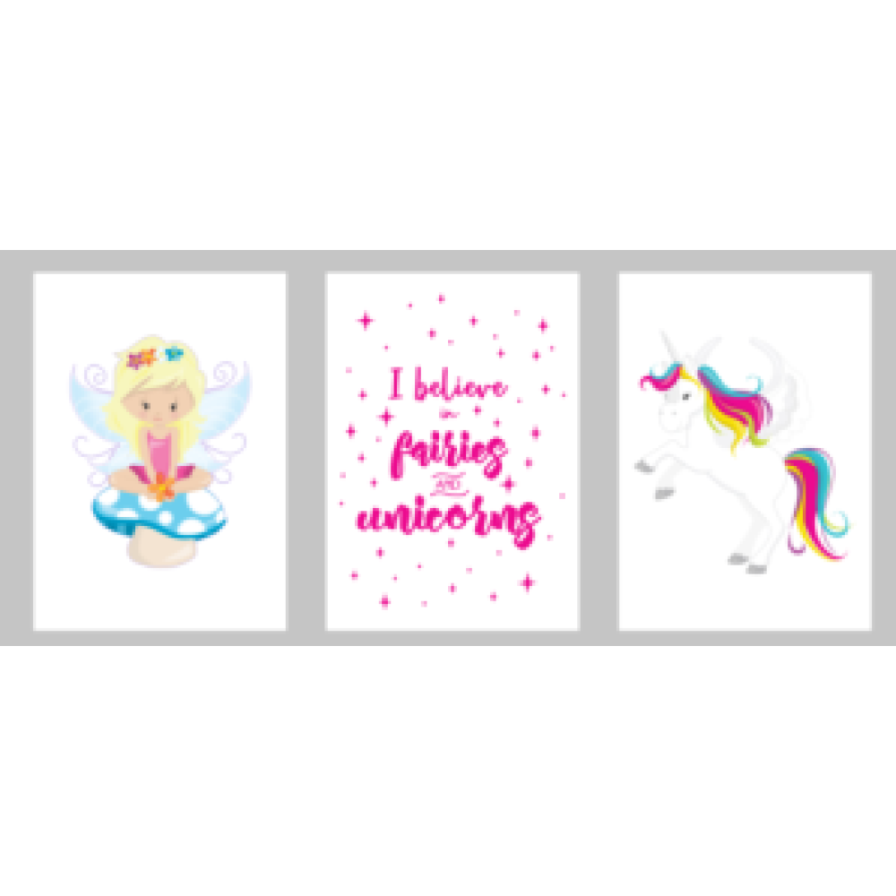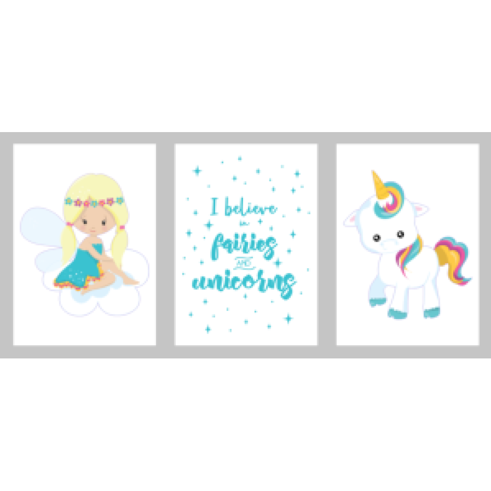 Set van 3 posters met elfje, eenhoorn en de tekst "I believe in fairies and unicorns"