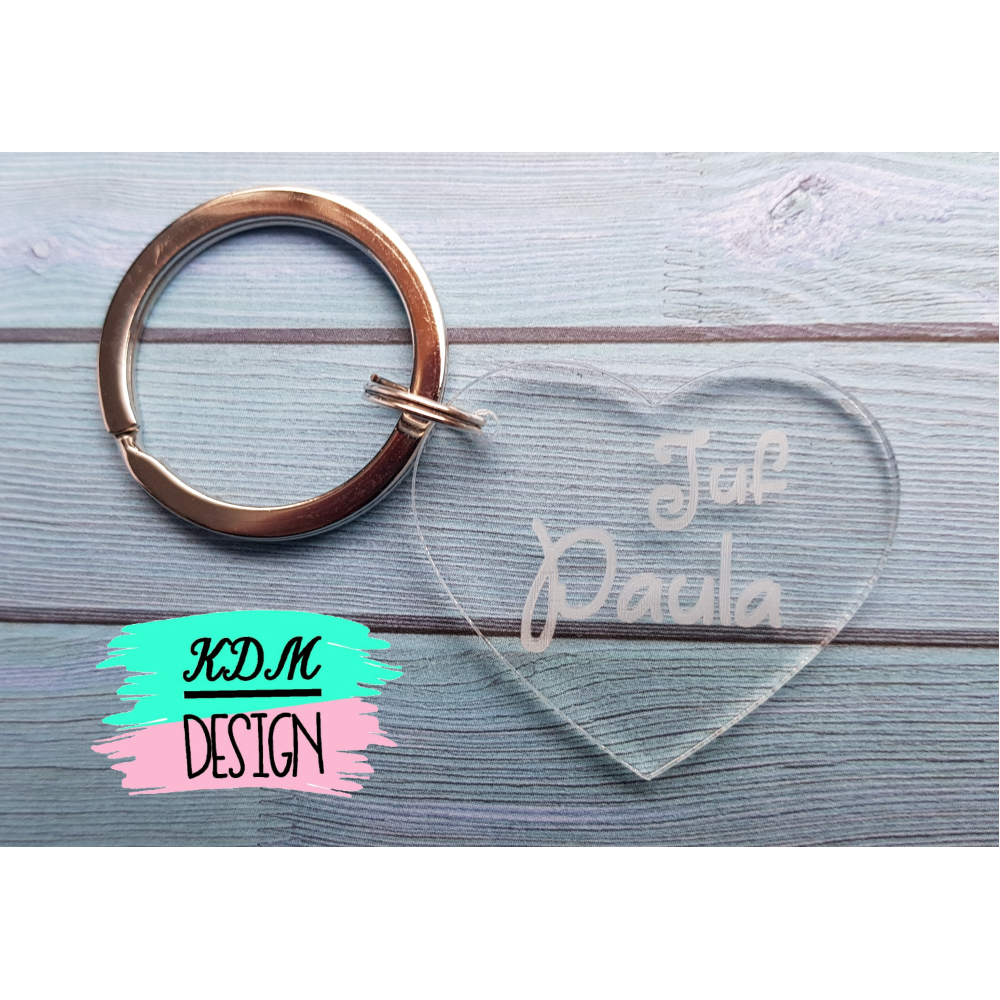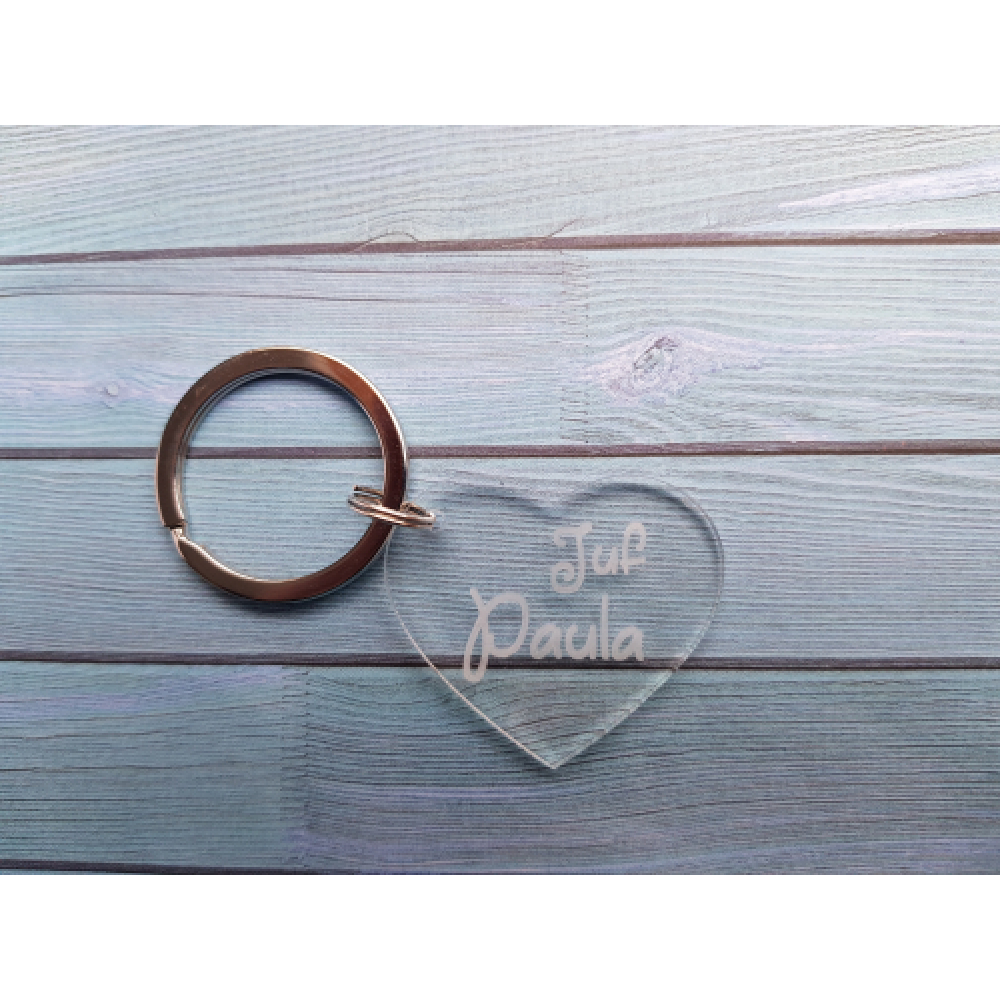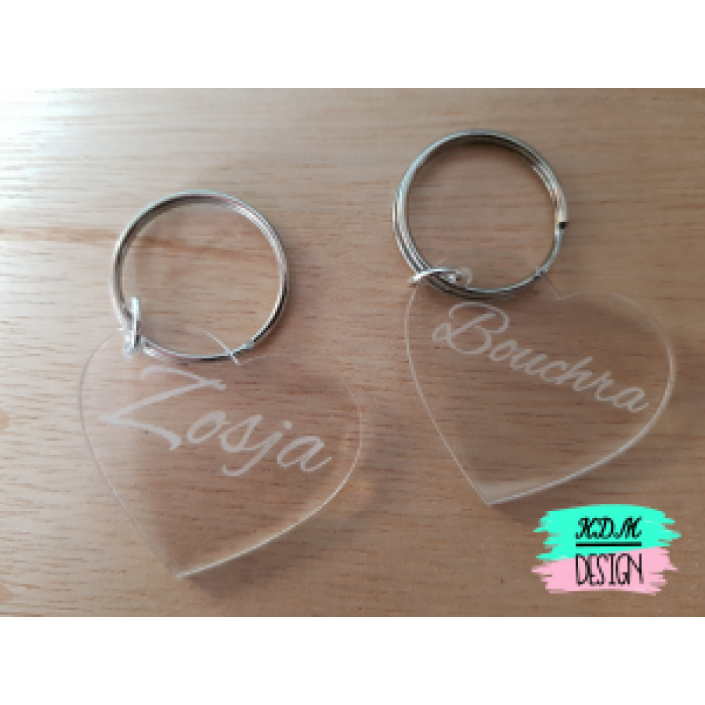 De sleutelhanger is transparant, de gravering is wit (melkglas kleurig).