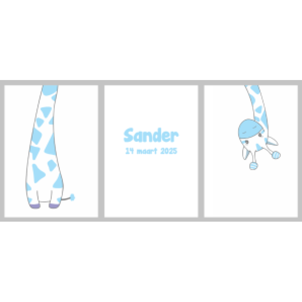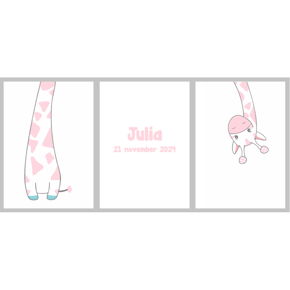 Deze poster met naam en geboortedatum is een unieke manier om de babykamer of kinderkamer te versieren. De grappige giraffe afbeelding maakt de poster extra vrolijk en speels en zorgt voor een kleurrijke en levendige uitstraling die perfect past in elke kamer.