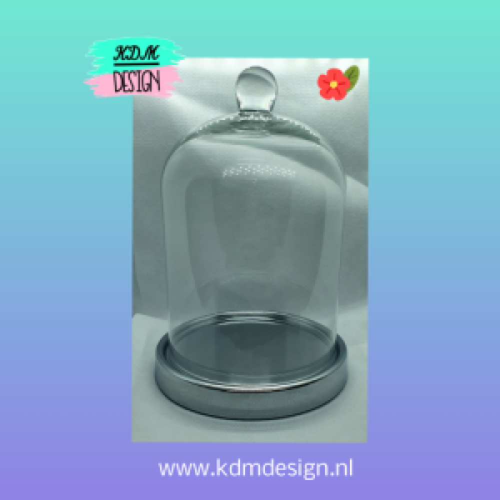 Mooie glazen stolp met kunststof voet in zilverkleur en voorzien van fluwelen onderkant, zodat er geen beschadigingen op de meubels komen.