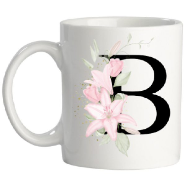 Toffe koffiemok met full color opdruk van een letter met roze bloem.