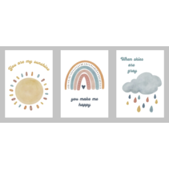 - Set van 3 digitale posters met de ontwerpen "You are my Sunshine", "You make me Happy" en "When Skies Are Grey", elk met een vrolijke en zachte afbeelding van de zon, regenboog en wolken