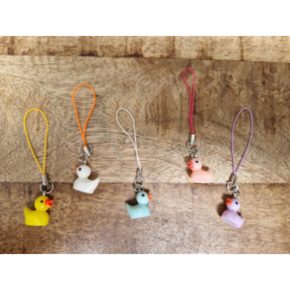 De eendjes zijn er in 4 kleuren en voorzien van een bijpassend koordje, waarmee je hem aan je jas, tas,rits, sleutelhanger of wat dan ook kunt hangen.