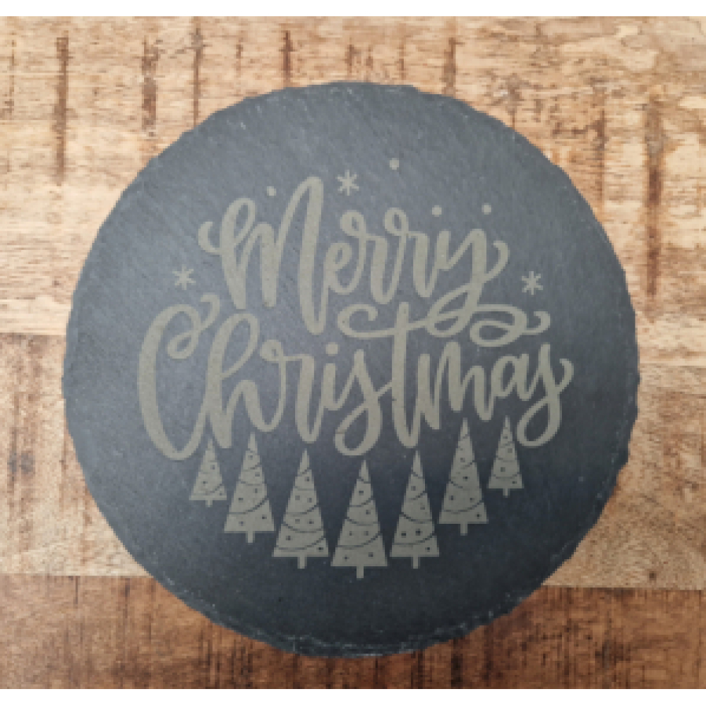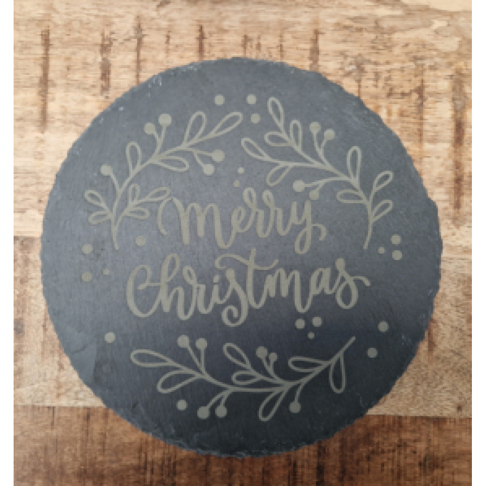Serveerplank of kaarsenbord van Leisteen met leuke gelaserde kerstafbeelding.
