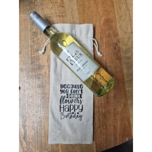Leuke wijnzak van katoen en linnen met opdruk "Because you can't drink flowers. Happy Birthday"